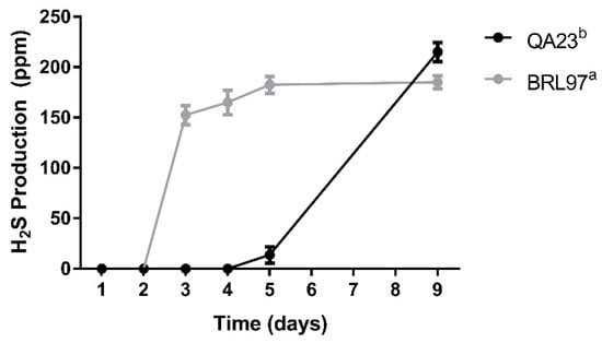 Hydrogen sulfide production differed between strains when SO2 was added (Figure 4), but no H2S was produced by either strain in the absence of SO2 (data not shown). In the SO2 treatments, both strains produced similar levels of H2S by the end of the nine-day fermentations, but their rates of production differed. Neither strain produced H2S by Day 2, but by Day 3 H2S production began to differ. Between Day 2 and Day 3, BRL97 produced an average of 152 ppm H2S. After this rapid increase, H2S production slowed for the remainder of the fermentation for BRL97. QA23 did not produce any H2S until Day 5, after which time H2S production increased to an average of 215 ppm by Day 9.