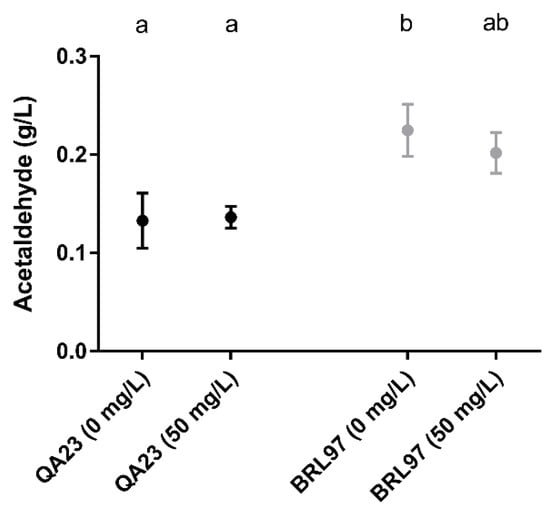 Acetaldehyde production (g/L ± SEM) by different yeast strains when fermented in the presence of 0 or 50 mg/L SO2. Different letters written above each treatment indicate significant differences in acetaldehyde concentration (2-factor ANOVA, α = 0.05).