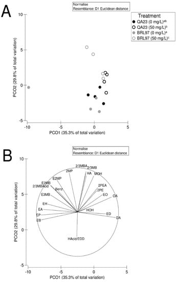 The composition of volatile secondary metabolites was affected by both yeast strain and SO2 treatment (Table 2), and a PCoA ordination was created to visualize the spatial distribution of samples with respect to their volatile profiles (Figure 6). This PCoA showed that the separation of samples by SO2 treatment and by yeast strain was achieved with the second principal component (PCO2), representing 29.8% of total variation. When no SO2 was added, both QA23 and BRL97 produced similar volatile profiles (Figure 6A). Additionally, the overall composition of volatile secondary metabolites of the wines fermented by QA23 was not significantly altered by the addition of SO2, although the relative abundance of some specific metabolites did vary (Table 3, discussed below). However, the production of volatile compounds by BRL97 was affected by SO2 addition, and more variation was observed among replicates for the wines fermented by this strain.