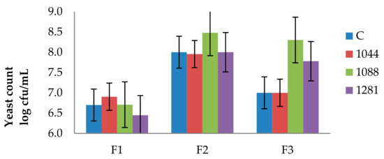 The growth of yeasts during fermentation. F1 is the beginning of fermentation, F2 is middle of fermentation, and F3 is end of fermentation. C represents wine inoculated with control strain, 1044 represents wine inoculated with 1044, 1088 is wine inoculated with 1088, and 1281 is wine inoculated with 1281.