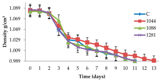 Daily fermentation monitoring in Narince must be fermented with different yeasts. C represents wine inoculated with control strain, 1044 is wine inoculated with 1044, 1088 is wine inoculated with 1088, and 1281 is: wine inoculated with 1281.