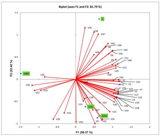 Principle component analysis according to yeast strain, based on volatile compositions of wines. Note: C = wine fermented with control strain; 1044 = wine fermented with autochthonous 1044 yeast; 1088 = wine fermented with autochthonous 1088 yeast; 1281 = wine fermented with autochthonous 1281 yeast; V = variable—the numbers that correspond to each compound are shown in Table 3.