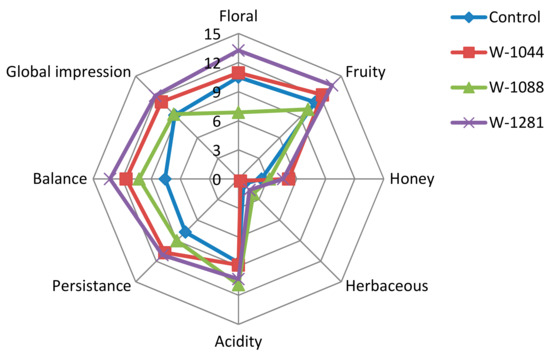 The sensory properties of the four experimental wines considered in this study were performed by a sensory panel using eight attributes: floral, fruity, honey, herbaceous, acidity, persistence, balance, and global impression (Figure 4). Regarding fruity and floral properties, wine 1281 achieved the best score for both attributes, followed by 1044 and control, respectively. The wine fermented with autochthonous 1088 strain achieved the lowest score for those attributes. This result was in agreement with the aroma composition of this wine, because the wine fermented with 1088 contains the lowest amount of acetate and ethyl esters (except ethyl octanoate and isoamyl acetate), which contribute fruity and floral characteristics. Further, 1044 strain achieved the best score for honey attribute, while 1088 achieved the best for the acidity attribute. Wine produced with 1281 also achieved the best score for both balance and global impression. These results were in agreement with the differences found at the chemical level. Wine fermented with autochthonous 1281 and 1044 contain higher amounts of acetates (isoamyl acetate (fruity), hexyl acetate (sweet, perfume), 2-phenylethyl acetate (floral)) and most of the ethyl esters (ethyl butyrate (fruity), ethyl hexanoate (green apple), ethyl lactate (lactic, fruity), ethyl decanoate (floral, soapy)), (Table 3), followed by control strain. However, the chemical composition of the wine and the interaction between the compounds and their effects on the sensory properties are still very complex and not well known [4].