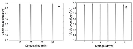 The experiments were performed on two independent batches and were repeated twice for each batch. The results of the first step were analyzed through a two-way analysis of variance and Tukey’s test as a post hoc comparison test (p < 0.05). The contact time and the duration of the storage were used as categorical predictors, while the viability of yeasts was the dependent variable.