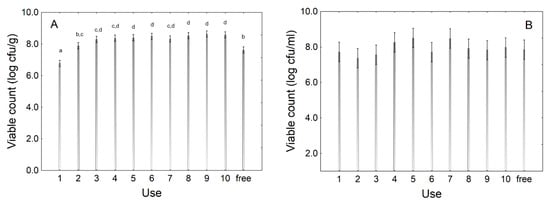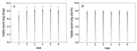 Figure 3 shows the results for experiment B (pieces stored at 4 °C before their use). As expected, the viable count of S. cerevisiae on apple pieces increased after the first use (from 6.72 log cfu/g to 7.92 log cfu/g) (Figure 3A) (p < 0.05). In cider, the yeast was at 7.78–7.90 log cfu/mL without significant differences (p > 0.05) (Figure 3B), thus suggesting that a preliminary storage of apple pieces did not affect their performance as reusable biocatalysts.