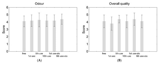 Results for the sensory scores (odor and overall acceptability) (mean ± standard deviation). Free, cider produced with free S. cerevisiae; 1st, 5th, and 10th use: cider from experiment A (A) with apple pieces used 1, 5, or 10 times; 1st use-sto and 6th use-sto: experiment B (B) (apple pieces stored at 4 °C for 7 days before their use) pieces used 1 or 6 times. The samples were not significantly different (p > 0.05, Friedman test).