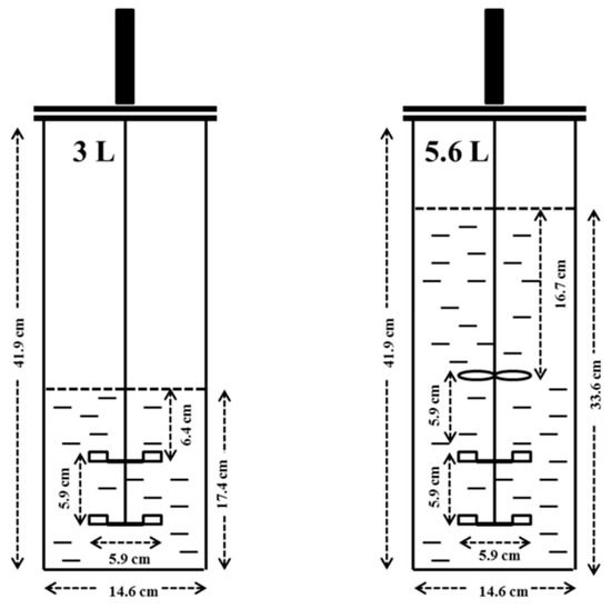 A 7-L Bioflo 415 CSTR (New Brunswick Scientific Co., Edison, NJ, USA) was used, which is 14.6 cm in diameter and 41.9 cm in length (Figure 1). The configuration of the CSTR followed the suggestions by Bakker and Myers [35]. Four baffles, each 1.3 cm in width and 34.6 cm in length, were used to avoid liquid vortices. Two working volumes of 3 and 5.6 L of water at 43% and 80% of the total CSTR volume, respectively, were examined. The number of impellers mounted on the drive shaft was based on the ratio of gassed liquid level to the CSTR diameter [35]. Thus, two six-blade Rushton impellers were chosen with the 3 L working volume (Figure 1). For the 5.6 L working volume, three impellers were used consisting of two six-blade Rushton impellers and one curved three-blade marine impeller pumping downward (Figure 1). The downward marine impeller was selected to increase the gas retention time in the liquid and increase mass transfer area. The distance between all impellers was equal to the impeller diameter.