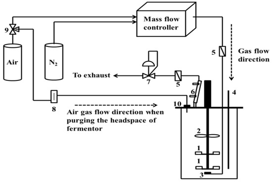 The setup for the mass transfer study in the CSTR is shown in Figure 2. N2 or air (UHP/Zero grade, Stillwater Steel Co., Stillwater, OK, USA) was fed to the CSTR using a microsparger with 10–15 µm pore size (New Brunswick Scientific Co.). The inlet N2 and air flow rates were controlled by two separate thermal mass flow controllers (MFC) (Burkert, Charlotte, NC, USA). Two 0.2 µm pore size gas filters (New Brunswick Scientific Co.) were used in the inlet and outlet gas lines. The CSTR temperature was controlled at 37 °C by a water heating jacket. A dissolved oxygen (DO) probe (InPro 6830, Mettler Toledo, Columbus, OH, USA) was used to measure % DO saturation.