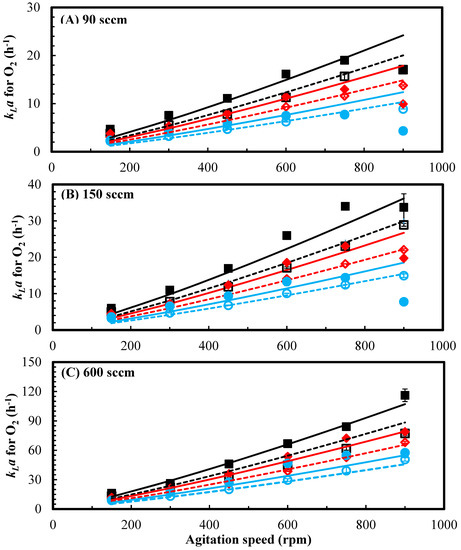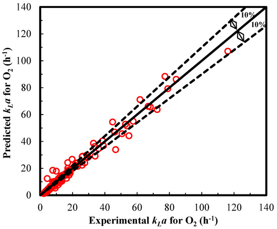 In the present study, the values of α and β parameters of 0.39 and 0.79, respectively, were within the previously reported range. As shown in Figure 3, there were less than 10% variation between the experimental data and model predictions of the kLa for O2 in the CSTR with 5.6 L working volume. When agitation speeds were low, mainly 150 to 600 rpm in 3 L working volume, less than 10% variation between the experimental and predicted kLa values for O2 were observed. However, there were 30% to 60% variation between the experimental and predicted kLa values for O2 in the 3 L working volume at low standard flow rate 90 and 150 sccm and agitation speed above 750 rpm. This was due to the backmixing of N2 that lowered the observed kLa deviating from model predictions. The superficial gas velocity vg in Equation (11) was determined using the volumetric flow rate at 37 °C as shown in Equation (13). Higher headspace pressures for the same standard flow rate in sccm resulted in lower volumetric flow rates in mL min−1 at 37 °C and lower vg and kLa. The model predictions of kLa for O2 were compared with the experimental results at various agitation speeds and volumetric flow rates (Figure 4). In addition, the model predictions of the kLa for O2 were plotted versus experimental data, which were mostly within 10% of variance (Figure 5). The R2 value for model predictions of the experimental data was 0.97, indicating a very good fit.