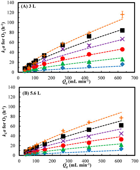 The 3 and 5.6 L working volumes used were 43% and 80% of the total bioreactor volume (7 L), respectively. It is desired to operate the bioreactor at high working volume to increase the amount of products produced. However, factors such as power consumption and foam formation should be considered when selecting the working volume. The power per unit volume, Pg/VL, was calculated using Equations (6) to (10). Increasing the agitation speed from 150 to 900 rpm increased power consumption from 33 to 8181 W m−3 and from 21 to 5216 W m−3 in the 3 L and 5.6 L working volumes, respectively. The Pg/VL slightly decreased (no more than 8%) when air flow rate was increased from 90 to 600 sccm and headspace pressure was increased from 101 to 240 kPa. This showed that the increase in flow rate and headspace pressure within the tested ranges had small effects on Pg/VL.