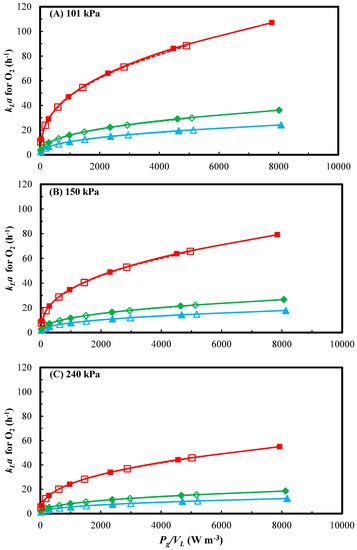Profiles of predicted kLa for O2 with Pg/VL at various headspace pressures (A) 101 kPa (B) 150 kPa (C) 240 kPa and 90 sccm (▲), 150 sccm (♦) and 600 sccm (■) in 3 L working volume (solid symbol and solid line) and 5.6 L working volume (open symbol and dash line).