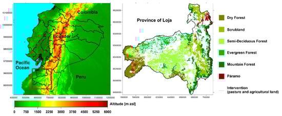Digital Elevation Model (DEM) of continental Ecuador (left) and natural ecosystems of the province of Loja (right). The map was adapted from the Ecuadorian Ministry of the Environment []. The red symbols indicate the sampling point of the Xylaria spp.