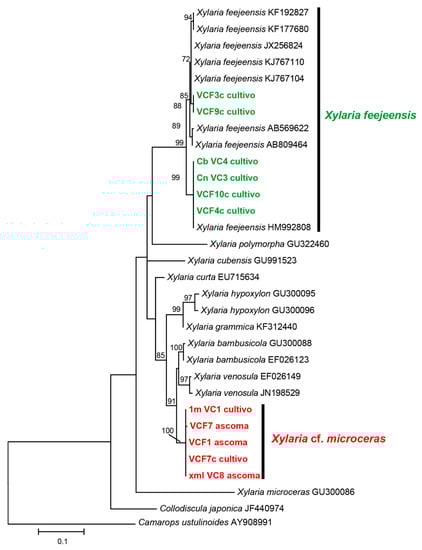 Phylogenetic location of X. feejeensis (green) and X. cf. microceras (red) based on our ITS-5.8S sequences (in bold) and the most related sequences from the GenBank. Only values ≥ 70% are shown on the nodes. The sequence from Camarops ustulinoides with accession number AY908991 was used as out group.