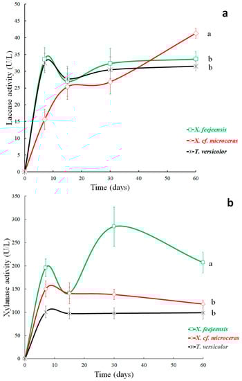 During the complete observation period, the xylanase activity of X. feejeensis was always highest compared to the other two fungi, except on day 15 when the activity of X. feejeensis decreased and similar values for both Xylaria spp. were measured (140.8 U/L and 141.6 U/L). Highest activity of X. feejeensis was observed on day 30 with 284.3 U/L, but afterwards activity decreased. The xylanase activity of X. cf. microceras and T. versicolor started with lower values (150.3 U/L and 100.7 U/L respectively), but their activity curves showed similar behaviors (Figure 4b), decreasing slightly between day 7 and day 15 after incubation and then remained almost stable during the rest of the observation period, reaching final values of 117.9 U/L (X. cf. microceras) and 99.0 U/L (T. versicolor). Statistically significant differences were found between X. feejeensis and the other two fungi species, but differences between X. cf. microceras and T. versicolor were not significant (Figure 4b).