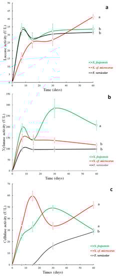 The degradation of lignin and cellulose is a consequence of the enzymatic activity of the fungi, which is mainly caused by the production of the enzymes laccase, xylanase and cellulase [,]. Figure 4 shows the variation in laccase (a), xylanase (b) and cellulase (c) activities for the individual fungus types during the incubation period.
