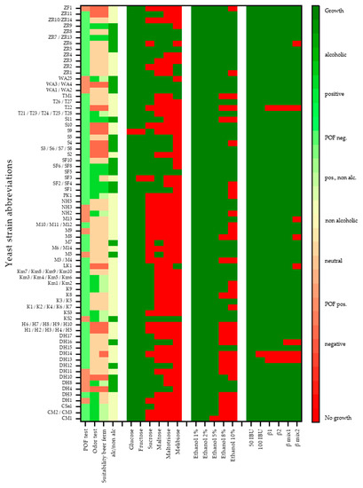 Primarily, yeast species were selected that were already used in food fermentations and are known for their aroma contribution, as described in the introduction. The heat map displayed in Figure 1 summarizes the results of the 96-well microtiter plate tests and gives an overview of the brewing ability of the selected 110 yeast strains from 18 yeast species with regard to the key parameters of wort sugar utilization, the ability to grow in hopped wort and ethanol resistance. Additionally, POF and odor tests were taken into consideration as the aim of this study was to identify yeast strains that are able to produce pleasant novel flavors during the wort fermentation, however, excluding POF positive yeast strains. Although non-alcoholic beers are as promising as those with an average alcohol content, this study first focused on the yeasts strains which are able to metabolize maltose to produce a standard or at least an alcohol-reduced beer.