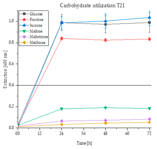 The diagrams (Figure 2, Figure 3 and Figure 4) represent the extinction curves at 600 nm of carbohydrate utilization, ethanol and hop tolerance using the yeast T. delbrueckii T21 as an example over a measurement period of 72 h and an incubation temperature of 28 °C. The yeast T. delbrueckii T21 was selected as it is maltose-negative and therefore, represents about 70% of the screened yeasts. The extinction threshold of whether the yeast has grown in the nutrient media was marked at 0.4 in the diagrams. Values above an extinction of 0.4 indicate significant growth, while values below 0.4 indicate that the yeast has not grown in the corresponding nutrient solution.