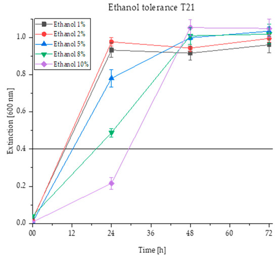 From Figure 3, in which the ethanol tolerance of the yeast strain T21 was investigated, it can be seen that the extinction curves for all concentrations of 1 to 10% (v/v) ethanol far exceed the threshold of 0.4. It is noticeable that the yeast growth within the first 24 h differs depending on the ethanol concentration. The higher the ethanol concentration in the nutrient solution, the slower the growth. This is shown by the decreasing turbidity at increasing ethanol concentrations. Nevertheless, there is significant growth at an ethanol concentration of up to 8% (v/v) after 24 h, while the growth in the 10% (v/v) solution remains below the 0.4 extinction threshold. During the second measuring day, all extinction values converge again and the yeast T21 also shows a significant growth at 10% (v/v) after 48 h of incubation. Taking the standard deviations into account, the extinction values all remain similar at approx. 1.0 after 48 h.