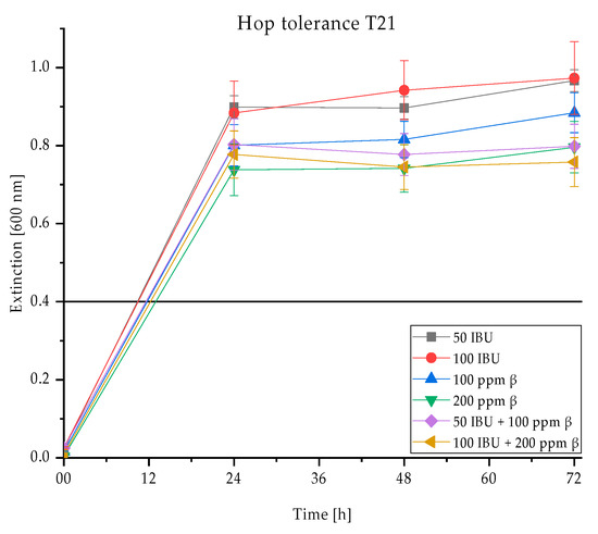 With regard to the yeast’s hop tolerance, Figure 4 demonstrates that the yeast T21 grows within 24 h of incubation at 28 °C in nutrient solutions with different hop acid additives as the curves already exceed the extinction limit of 0.4 during 24 h of incubation. While the curves of all nutrient solutions look similar and the yeast stops growing after 24 h in all cases, it can nevertheless be observed that the growth of the yeast T21 is the strongest at 50 and 100 IBU iso-α-acids. As soon as β-acids were added into the nutrient solutions, the extinctions and the corresponding growth of the yeast are slightly lower.