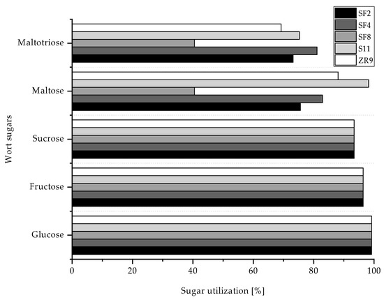 Wort sugar utilization in % of yeast strains S. fibuligera SF2, SF4, SF8, S. pombe S11 and Z. rouxii ZR9 during fermentation from wort to beers.