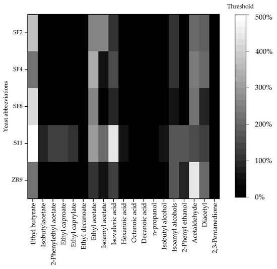 Heat map of volatile compounds in final beers produced by the yeast strains S. fibuligera SF2, SF4, SF8, S. pombe S11 and Z. rouxii ZR9 during fermentation of brewer’s wort at 27 °C and detected by headspace gas chromatography measurement. The 100% value represents the threshold of volatile compounds in beer, which is based on relative values from Meilgaard and Sannino et al. [29,31].