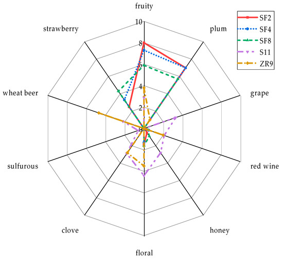 Aroma profiles of the beers fermented with the yeast strains S. fibuligera SF2, SF4, SF8, S. pombe S11 and Z. rouxii ZR9.