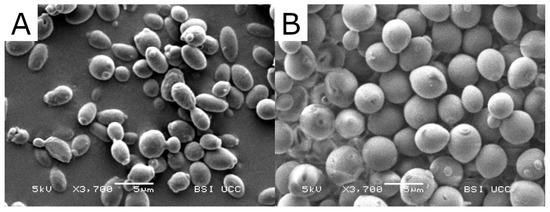 Scanning electron microscopy (SEM) picture of Cyberlindnera subsufficiens strain C6.1 (A) and the brewers’ yeast strain Saccharomyces cerevisiae WLP001 (B) at a magnification of × 3700. Size of bar: 5 µm.