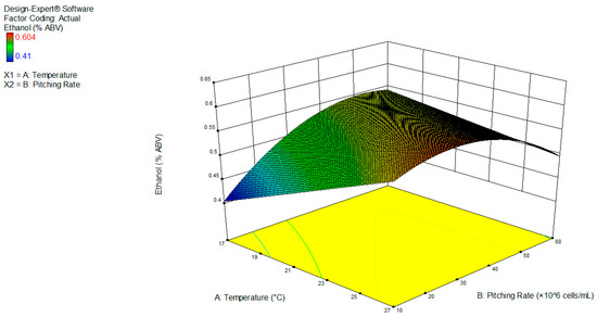 It was possible to create significant models for 12 responses (Table 7). However, five also exhibited significant lack of fit (LOF), rendering them unusable for predictions. The aim of the RSM was to investigate the optimal fermentation conditions to create a fruity, non-alcoholic beer. The three-dimensional response surface plots of the interactive effects of temperature and pitching rate on the final ethanol content and the fruitiness of the produced NAB are shown in Figure 3 and Figure 4.