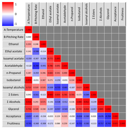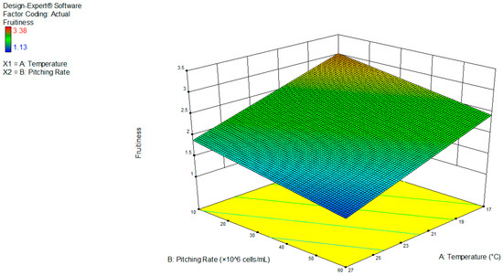 In terms of fruitiness, a low fermentation temperature paired with a low pitching rate led to the highest perceived fruitiness. Indeed, the highest fruitiness was recorded at 17 °C and 1 × 107 cells/mL and the lowest at 27 °C and 6 × 107 cells/mL, following a linear model. General acceptance showed a strong positive correlation with the fruitiness, indicating that the panel preferred fruity samples (Figure 5 and Figure A3).