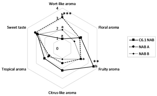 Spider web with the means of the descriptors from the sensory trial of the NAB produced with Cyberlindnera subsufficiens C6.1 and the two commercial NABs. Different letters next to data points indicate a significant difference as per Tukey’s post hoc test. Significance codes: *** p ≤ 0.001, ** p ≤ 0.01.