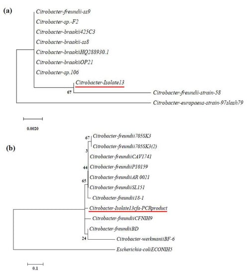 - Kaclikova, E.; Krascsenicsova, K.; Pangallo, D.; Kuchta, T. Detection and quantification of Citrobacter freundii and C. braakii by 5’-nuclease polymerase chain reaction. Curr. Microbiol. 2005, 51, 229–232. [Google Scholar] [CrossRef] [PubMed]