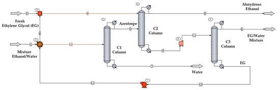 Ethanol was dehydrated in column C2 with the aid of EG and recovered as a head product. The bottom product of column C2 was expanded from 100 to 26.34 kPa and fed into column C3 for EG recovery as a bottom product. The decision variables used in the simulation after sensitivity analysis of the simulation flowsheet in