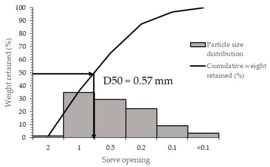 Carob pods purchased from a local supplier were physically and chemically characterized. The physical characterization consisted in the determination of their particle size distribution by sieve analysis. For that, 100 g of carob pod was sieved using for 10 min a set of sieves with 2.0, 1.0, 0.5, 0.2, and 0.1 mm mesh opening and a vibrating sieve machine. Sugar, ash, protein, and fibre analyses were carried out according to the methodology proposed by Mahtout et al. [