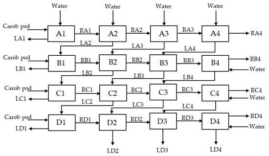 The present study revealed the feasibility of sugar extraction from carob pod using a four-stage counter-current system and an L/S ratio of 3.75, with sugar losses below 2%. The alcoholic fermentation of the aqueous extracts with a sugar concentration of 168 g/L using S. cerevisiae showed that a maximum ethanol concentration of 95 g/L was achieved after 20 h, independently of the initial concentration of the microorganism.