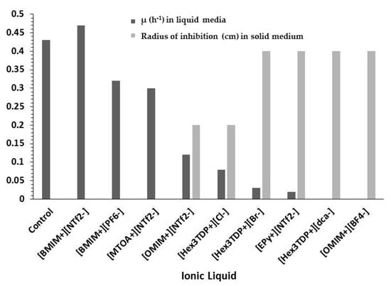 Ionic liquids biocompatibility was measured through growth inhibition in liquid medium and the agar diffusion test. For the growth inhibition tests, a liquid culture medium composed of D-glucose (20 g/L), peptone (20 g/L), yeast extract (10 g/L), and 3% (v/v) of ionic liquid was used. The ionic liquid content of the liquid medium was selected on the basis of previous research works, which report that a significant toxicity is observed for concentrations of ILs ranged between 2% and 5% (v/v) [