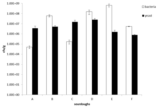 Six Italian sourdoughs collected from different localities, i.e., Monte Sant’Angelo (sourdough identified in this work by the letter A), Orsara di Puglia (sourdough identified in this work by the letter B), Trani (sourdoughs identified in this work by the letters C, D, and E), and Ortanova (sourdough identified in this work by the letter F) (Table 1), placed in the northern part of Apulia (southern Italian region), were collected and analyzed. Microbiological analysis of all sourdough samples revealed LAB and yeast counts in the range between 1.7 × 105 and 6.5 × 108 cfu/g, and 7.7 × 105 and 2.5 × 107 cfu/g, respectively (Figure 1). Generally, the sourdough microbial ratio LAB:yeasts was 100:1 [9] and for some of the analyzed samples, i.e., B (Orsara di Puglia), D (Trani 02), E (Trani 03) and F (Ortanova), we found this kind of proportion. Intriguingly, for two sourdough samples, i.e., A (Monte Sant’Angelo) and C (Trani 01), the ratio LAB:yeasts was around 1:100, hence the inverse of the ratio usually found.