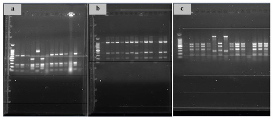 Restriction analysis examples of 16S rRNA genes using the AluI (a), HaeIII (b), and HinfI (c) enzymes.