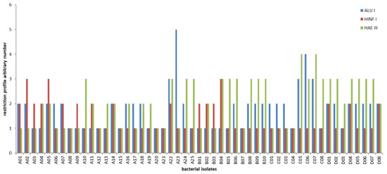 Histogram representation of different restriction profiles obtained using three different restriction enzymes (AluI, HaeIII, and HinfI). An arbitrary number has been attributed to each diverse digestion profile.