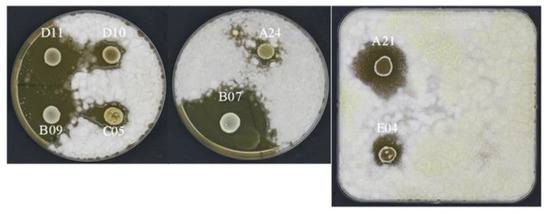 In this work, on the basis of the inhibition halo (Figure 5), the LAB isolates were classified into three different groups with no, mild, or strong antifungal ability, respectively (Table 5). P. roqueforti, P. chrysogenum, and P. expansum were the most resistant fungal strains since the tested LAB isolates were unable to inhibit their growth. Conversely, the growth of A. flavus was strongly affected by several isolates, e.g., the isolate B07 showed an inhibiting alone of 11 mm, while the isolates A11, A21, A22, and B09 were able to contrast the mold by showing an inhibiting alone of 10 mm. Overall, A. niger and F. culmorum were mildly inhibited by numerous isolates. In detail, the isolate E05 showed an inhibiting alone of 11 mm and the isolates C02, D03, and D08 showed an inhibiting alone of 9 mm against A. niger, while the isolate F02 was able to contrast the growth of F. culmorum showing an inhibiting alone of 13 mm.