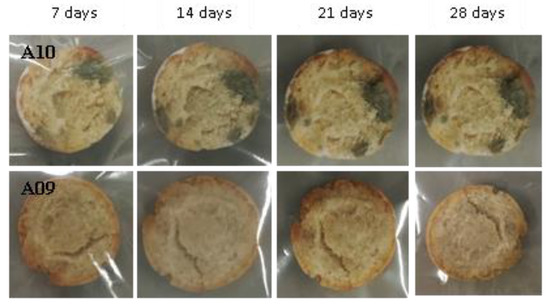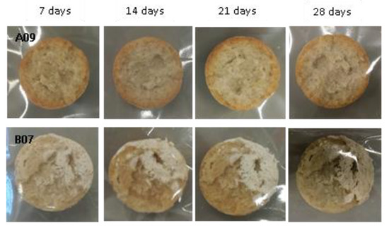 Examples of bread made from sourdoughs inoculated with the isolates A09 and B07, and then artificially contaminated with Aspergillus flavus and incubated at room temperature for 7, 14, 21, and 28 days.