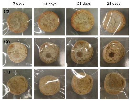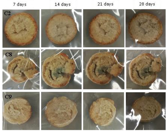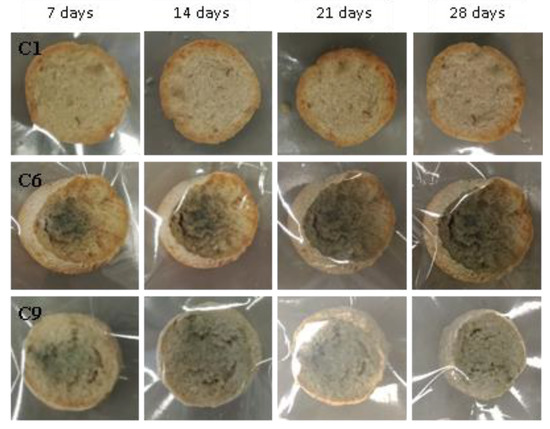Examples of bread made from sourdoughs inoculated with the combination of isolates C1, C6, and C9, then artificially contaminated with Penicillium expansum and incubated at room temperature for 7, 14, 21, and 28 days.