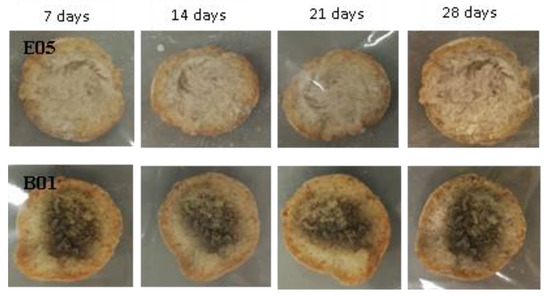 Examples of bread made from sourdoughs inoculated with the dual combination of isolates E05 and B01, and then artificially contaminated with Aspergillus niger and incubated at room temperature for 7, 14, 21, and 28 days.