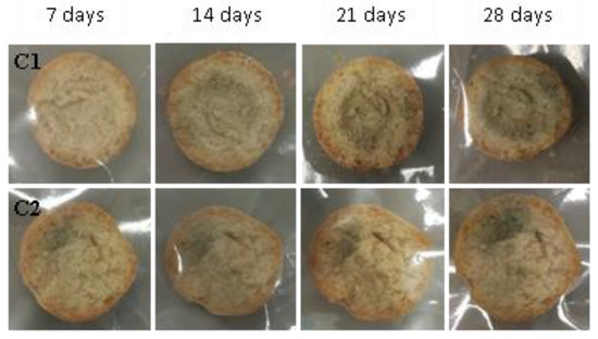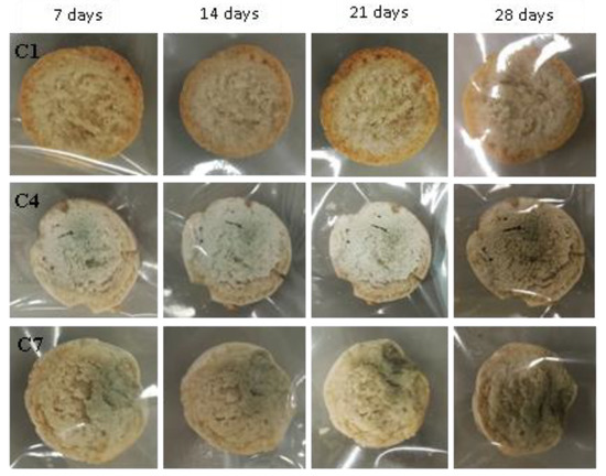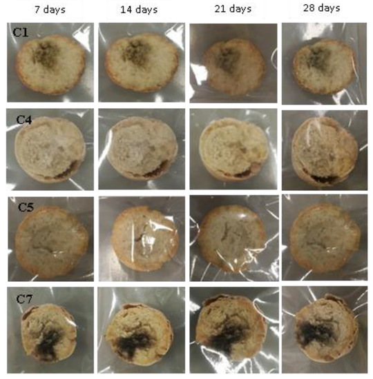 Examples of bread made from sourdoughs inoculated with the combination of isolates C1, C4, and C7, then artificially contaminated with Penicillium chrysogenum and incubated at room temperature for 7, 14, 21, and 28 days.