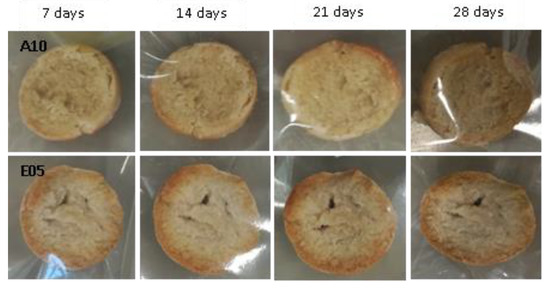 Examples of bread made from sourdoughs inoculated with the dual combination of isolates A10 and A09, then artificially contaminated with Penicillium expansum and incubated at room temperature for 7, 14, 21, and 28 days.