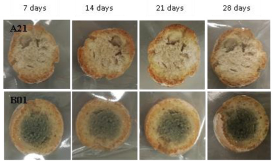 Examples of bread made from sourdoughs inoculated with the dual combination of isolates A21 and B01, then artificially contaminated with Penicillium roqueforti and incubated at room temperature for 7, 14, 21, and 28 days.