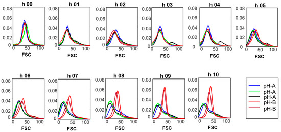 Bacterial stress response includes a wide variety of metabolic and physiological changes, including formation of inactive spores, shift into dormant states like viable-but-non-culturable (VBNC) states [8,17] and pleomorphism i.e., change of cell shape and size. The shift in cell size distribution as observed in the case of pH-B is a known response/survival strategy. Phenotypic heterogeneity of a population is a well-known strategy that allows for survival and functionality of the microorganism under stressful environmental conditions [18,19]. The importance of cell shape and size for the survival of bacteria in case of threats like nutrient depletion or pH stresses and the resulting morphological changes has been discussed in literature [9,20]. Several examples of cells changing size in response to the encountered stress are available. This includes studies such as Bifidobacterium changing their shape due to stress [21], and L. bulgaricus increasing chain length and shifting from rod shaped to filamentous form by inhibiting cell division upon encounter with alkaline pH [22] etc.
