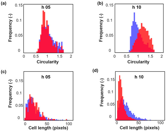 Normalized histograms for (a) circularity, 5th hour samples; (b) circularity, 10th hour samples; (c) cell length 5th hour samples; and (d) cell length 10th hour samples from one representative pH-A (blue) and pH-B (red) batch.