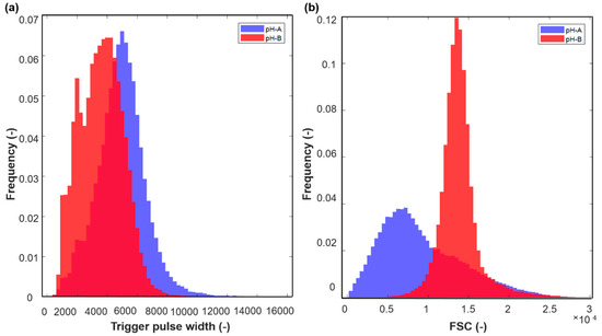 Normalized histograms of (a) flow cytometry trigger pulse width (b) forward scatter (FSC) signal for 10th hour samples taken from a representative pH-A and pH-B batch.