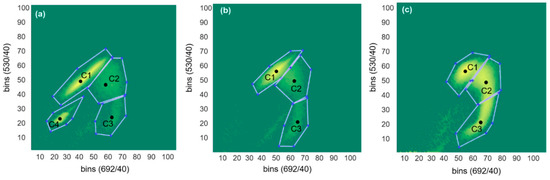 Plot of FL1 against FL2 fluorescence intensities showing four clusters (C1-live, C2-intermediate, C3-dead and C4-beads) identified using MATLAB scripts for (a) 10th hour sample from pH-A, (b) 10th hour sample from pH-B and (c) 7th hour sample from pH-C.