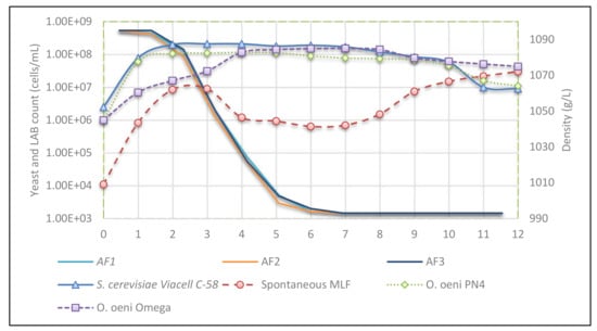 - Jussier, D.; Morneau, A.D.; De Orduña, R.M. Effect of simultaneous inoculation with yeast and bacteria on fermentation kinetics and key wine parameters of cool-climate Chardonnay. Appl. Environ. Microb. 2006. [Google Scholar] [CrossRef]